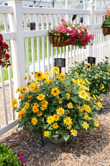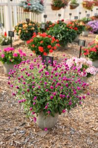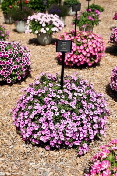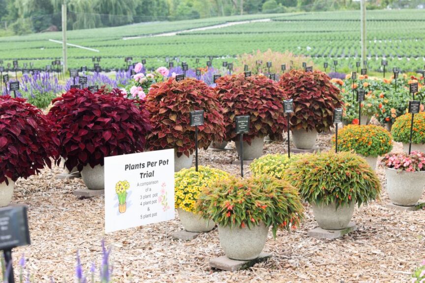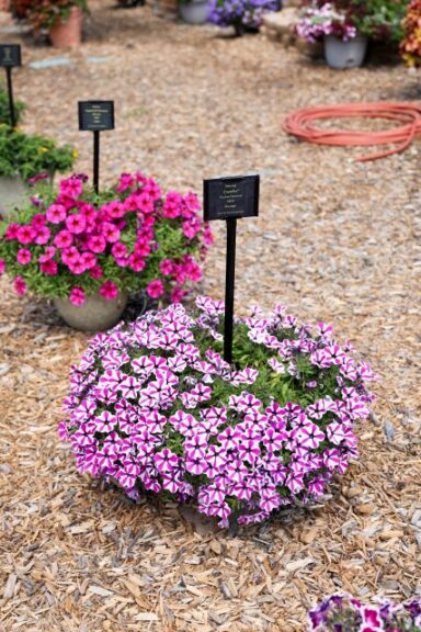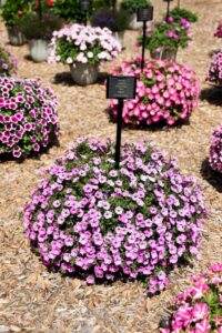 Our trial garden is what we like to call our living catalog. All the varieties we root and sell for the various breeders are represented in our garden, and that totals about 2,100 varieties on display. The garden also features around 500 mixed planters displayed hanging baskets, deco pots, and window boxes.