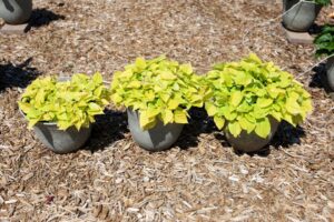 • Plants Per Pot trial: People frequently ask us how many plants we put in our pots. They tend to assume that we use more plants than average growers do, resulting in pots that present nicer than those of growers and homeowners and thus could be impractical for them. In response to their questions, we grew out some of our top items with either three, four, or five plants per 16-inch pot. We typically place five plants in each large pot, which gives us consistently good results with what has been a reasonable amount of plant material. The trial confirmed that for most varieties, four plants per 16-inch pot produced a beautifully finished pot.