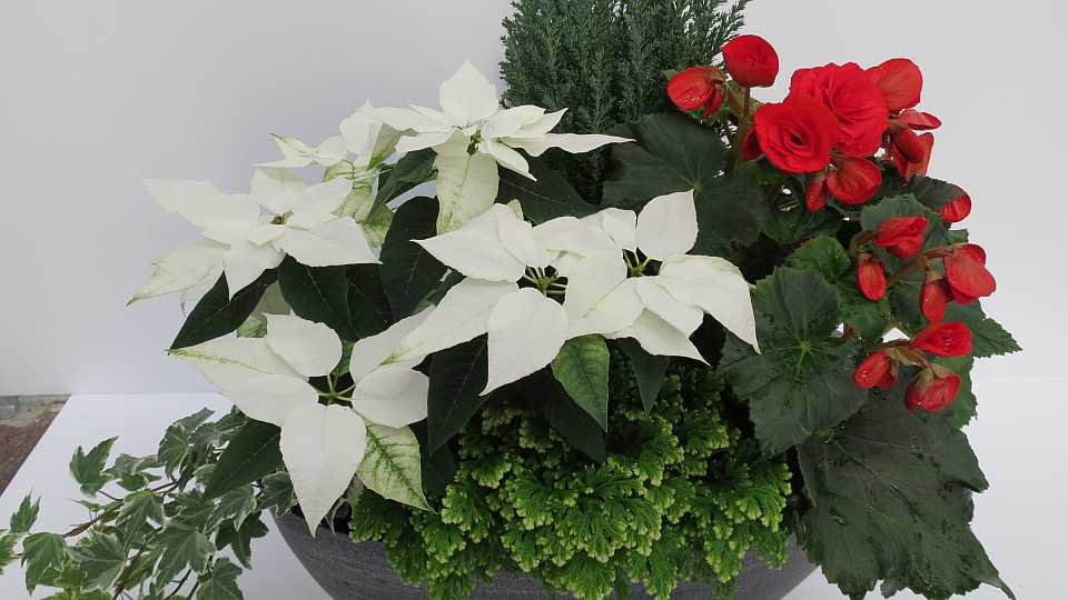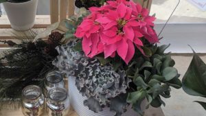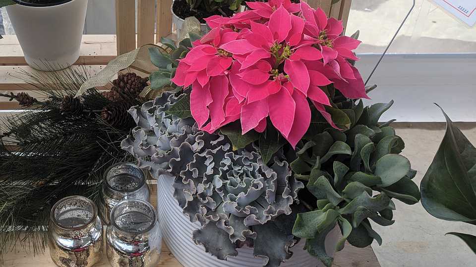 Barbara Jeffery-Gibson of Jeffery’s Greenhouses says these mixed planters with blooming potted plants like poinsettias and cyclamen mixed with foliage are an important part of holiday sales.
