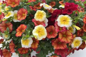Garden Gallery CAST Combo #1 (Selecta One), including Calibrachoa ‘MiniFamous Uno White Gold’, Calibrachoa ‘MiniFamous Uno Double Red’, and Calibrachoa ‘MiniFamous Uno Ember Eclipse’