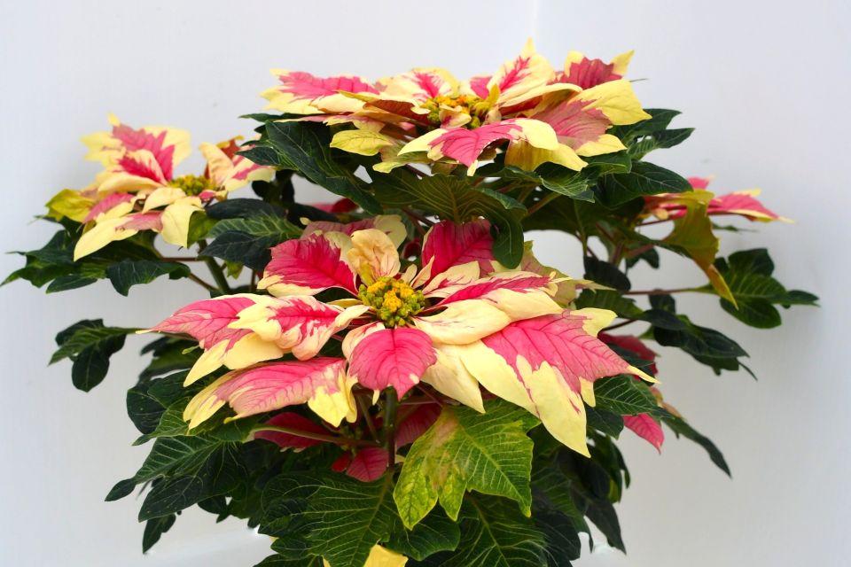(Clockwise from left) Poinsettia Superba poker, ‘Papagena’ offers a palette of creamy white and blush pink bracts, and Princettia Queen Rose Punch. | Mitchell’s Nursery, Plantpeddler, and Suntory Flowers