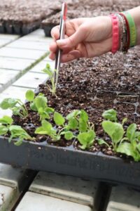 When you receive the stage 3 Garvinea TC plants, the plants are already taken out of the laboratory vessels and the agar is already rinsed off. The plants are carefully packed in paper towels and boxed with 100 plants per box. To transfer the plants into the trays, take them out of the box and place them into the soil, using a sterile tweezer or forceps. This should be carried out gently and precisely. Stick the rooted part of the plant in the center of the cell, just deep enough to anchor them well into the soil. Make sure not to stick them in too deep.
