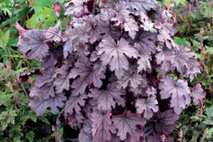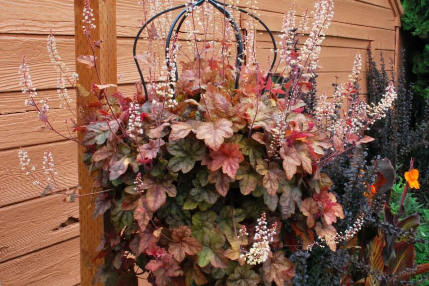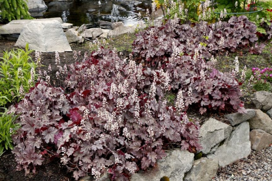 The Heucherella Cascade Series includes ‘Copper Cascade,’ a small-leaf trailer with rosy copper-gold foliage that holds its color year-round and drapes cleanly — ideal for spilling from window boxes and balcony planters. ‘Copper Cascade’, in comparison with ‘Redstone Falls, sits lower, carries more flexible stems, shows smaller leaves, and presents a more saturated palette. ‘Plum Cascade’ — also in the Cascade™ Series — is Terra Nova’s first purple trailer, featuring ruffled purple-silver leaves, small light-pink summer flowers on short stems, and a strong, tidy habit that flows over raised beds and retaining walls.