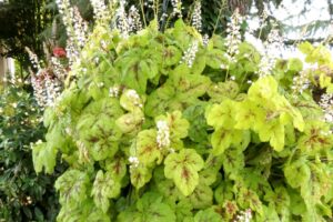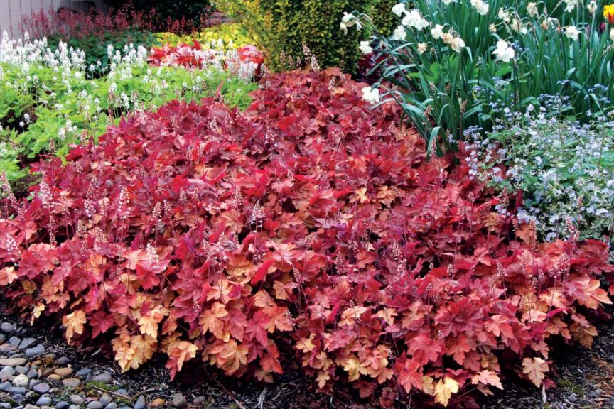 The Heucherella Falls Series showcases vigorous trailers lauded for shifting seasonal color and broad adaptability. Heucherella ‘Yellowstone Falls’ offers chartreuse, lobed leaves with deep crimson veining and stems that can trail up to 3 feet. Heucherella ‘Redstone Falls’ displays ruby-splashed, butterfly-like foliage that warms through the year, integrating into mixed borders where it threads color between upright grasses and structural perennials.