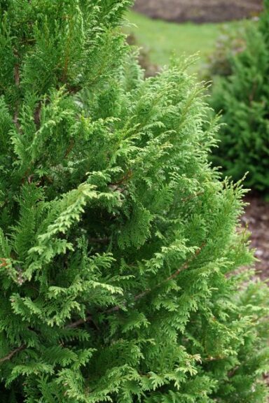 - Chamaecyparis pisifera ‘Cedar Rapids’ will give a lush evergreen and privacy with a unique texture. This is a fast-growing feathery selection of false cypress with fresh-looking, lime-green foliage. USDA Zone 4 to 8, height 30 feet, width 12 to 15 feet.