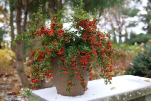 - Pyracomeles ‘Berry Box’ is a joyful little pyracantha-esque shrub. It’s a showy selection, from its button-like blooms in spring, to late-summer/fall when it is draped with colorful, pea-sized berries that change from orange to red. Hardy in USDA zones 7(6b) to 9, height 2 to 3.5 feet, width 2 to 3′ feet.