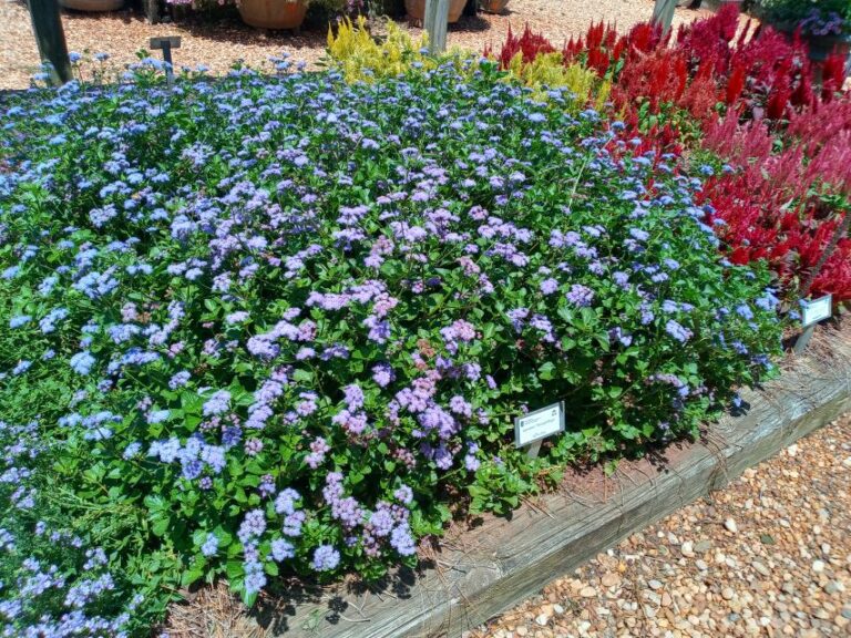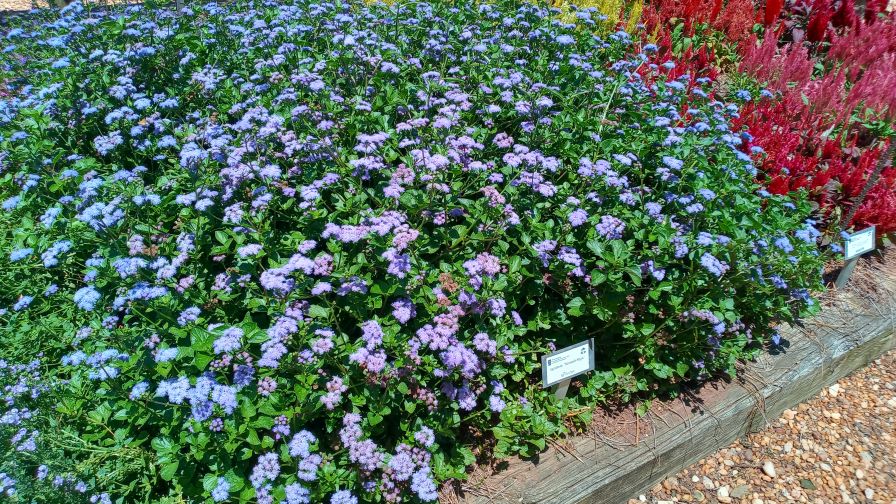 Ageratum ‘Monarch Magic’ from Ball FloraPlant has provided show-stopping, densely packed blue flowers that attract butterflies and people alike. The habit is large and shrub-sized with soft round edges that fill the space.