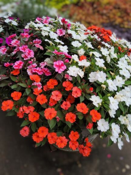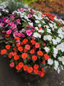 The Trial Garden received more combos than ever in 2024. Thanks to Sakata Ornamentals, we have some great examples of perfectly balanced ‘SunPatiens Pop Life’ in ‘Compact Red Candy,’ ‘Compact Classic White,’ and ‘Compact Hot Coral’ from their Playlist Combo Series.