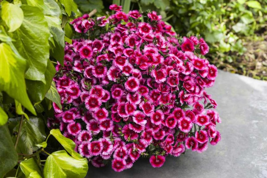 IQ Dianthus flower up to five days earlier than other dianthus. They are very floriferous, with a uniform canopy of flowers. Plants are naturally dwarf in habit and grower friendly. Less plant growth regulators are needed to grow them, so they make for a neater pack at retail. They’re also make a great pot bedding item. Colors in the series include: Red, White, Scarlet, Purple, Pink, Blueberry Picotee, Red Picotee, Raspberry Picotee, and Purple Ice. Pictured: Raspberry Picotee -