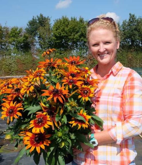 Pacific Plug & Liner (PP&L) has two new selections it plans to release at Spring Trials this year, names to be announced at that time. One thing to note for growers is the vigor of the program. One 72-cell liner can easily fill larger pots such as 1½ gallons and deco pots. For a sneak peek, PP&L Marketing Director, April Herring-Murray, is pictured with one of the varieties this past summer. Note the huge flowers and interesting fringles in the center of the flower. -