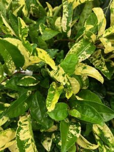 This highly variegated Camelia is a small shrub that grows to 6 feet with shiny green and yellow variegated leaves and small yellow flowers. https://www.youngbloodnursery.com
