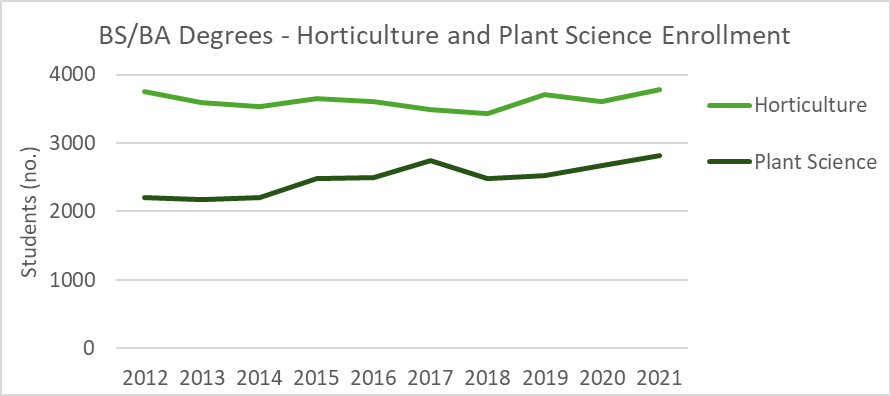 Interesting to note, 26 universities reported enrollment numbers but did not report for specifically horticulture programs. One of the main reasons is that horticulture programs at several universities were combined into a plant science program with agronomy, forestry, or other departments as an umbrella term. Plant science enrollment has been increasing since 2013, reaching a ten-year high in 2021 at 2816 enrolled students.