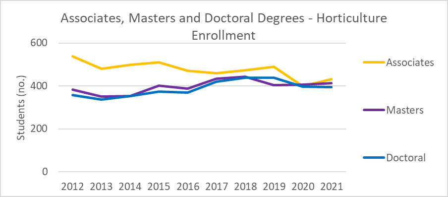 Table 2. Enrollment in Horticulture Associates, Masters and Doctoral degrees from 2012 to 2021.