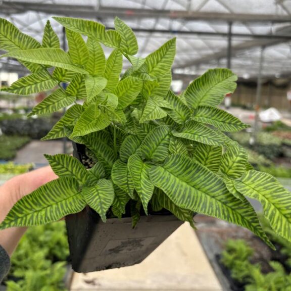 Coniogramme emeiensis ‘Golden Zebra’ is hardy to Zone 7 and features long (18-inch) arching fronds with lime-green striations.