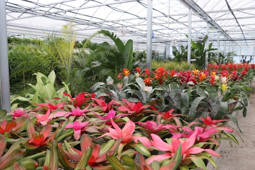 Tropical Foliage Plants grows a variety of items, including tradescantia, Boston ferns, spiders, 2-inch terrariums, poinsettias, potted bulbs, potted annuals, hanging baskets, and patio pots. The business receives a diverse array of plants from its suppliers, including echeveria, bromeliad, aroid varieties, and trending plants, such as Philodendron ‘Pink Princess’ and Monstera ‘Thai Constellation’.