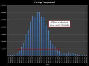 Most operations we visited had benefited from a lean flow consultant to review aspects tracking each tray with the employee name, recording individual and/or team goals and performance on visual scoreboards, and minimizing wasted movement such as each grower having to stand up and get their own fresh cuttings and materials.