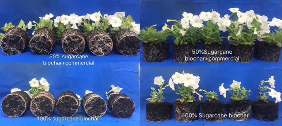 Biochar types and rate influence plant growth differently. We tested sugarcane bagasse biochar and mixed hardwood biochar on tomato and basil plant growth (Figure 1-2). Tomato and basil plants grown in sugarcane bagasse biochar, and mixed hardwood biochar mixes had similar growth compared to those grown in commercial mixes. When we tested the same types of biochar with different rates on pepper and petunia (Figure 3-4), we found that pepper plants in 50% and 70% of mixed hardwood biochar had similar growth compared to these in a commercial substrate. On the other hand, petunia grown in the 50% of sugarcane bagasse biochar had better growth than those in 100% (Figure 4).