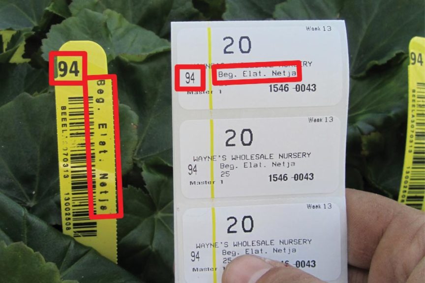 Take a digital photo of a representative example of each of your label types (such as a tray or pot label, employee label, master pull, and individual shipping labels). Insert the images into PowerPoint or a similar graphical editing program. Crop the photos to trim out any background you do not need. Insert call-outs or text boxes that identify symbols, colors, numbers, and words. Discuss with the supervisor to ensure you use the same languages and jargon terms that your own employees use, because terms vary between countries of origin and greenhouse businesses (click here to download a list of common label terms in both English and Spanish). Print, trim the pages to pocket size, and laminate.