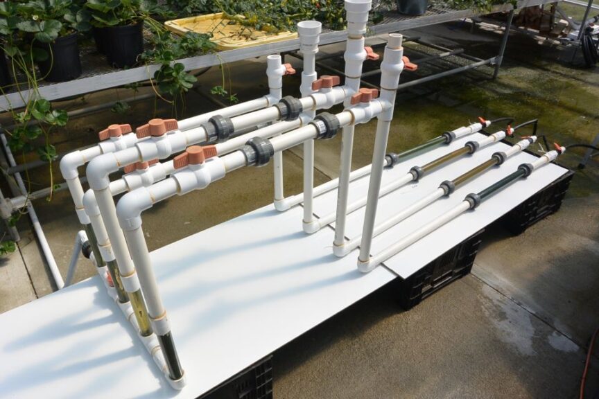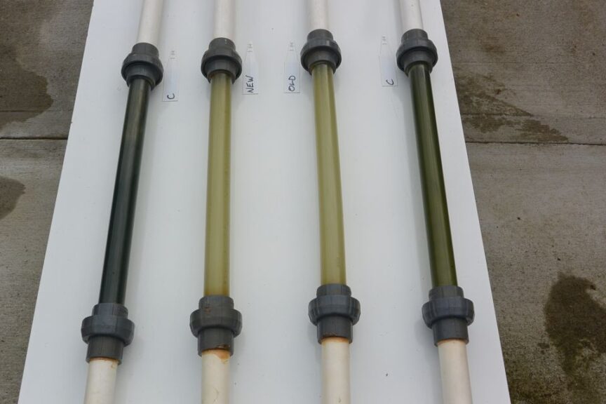Figure 3 shows an experimental irrigation setup designed to test various irrigation line treatments to control algae and biofilm. Clear sections of PVC pipe allow for visual, nondestructive monitoring both up and down stream from treatment. Fertilizer is injected normally into the source water feeding into the setup on the left. Short, clear vertical PVC sections allow visual monitoring upstream of treatment, valves and treatment injection sites are shown in the middle, and post-treatment clear horizontal PVC sections are seen at the lower right with valves to simulate irrigation events. Hence the clear PVC sections provide “before” and “after” treatment visuals.