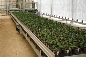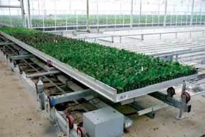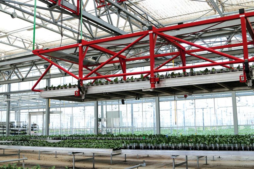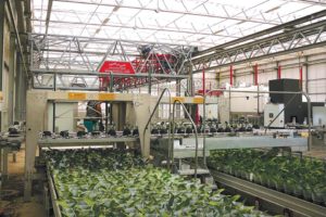 The Salinas facility has four overhead cranes (two in the working area, two in the growing area), manufactured in Holland by VanZaal. They crawl along metal tracks to bring tables to the working area and deliver them to various locations throughout the greenhouses. The greenhouses were also manufactured in Holland and built by Greenhouse System USA in Watsonville, CA.