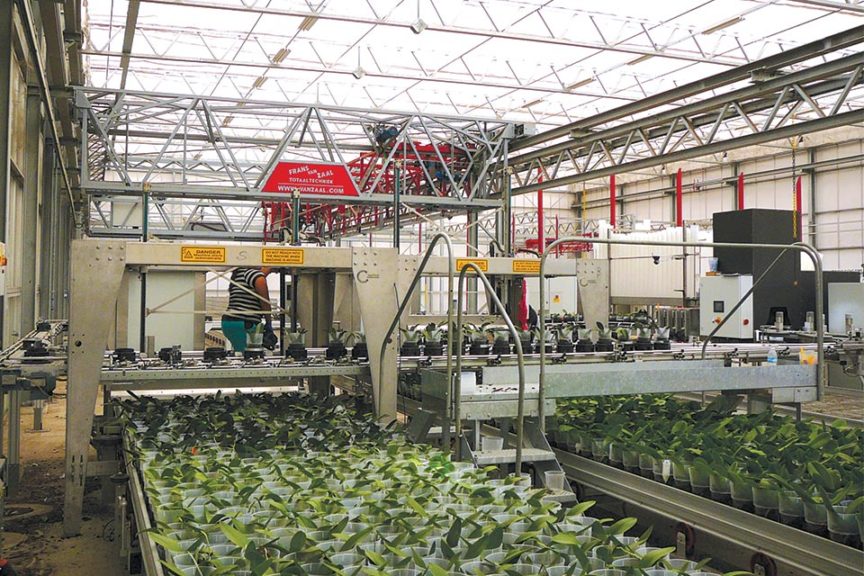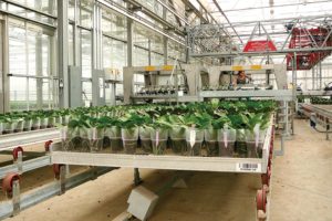 Crea-Tech International BV in The Netherlands built the planting and spacing machines for Floricultura Pacific. The planting machine includes a revolving table that supplies planting media and delivers empty pots to people around the table. The planters place the plants in pots with the media. From the table, plants move through a computerized camera system that takes photos of each plant as it passes. The machine also sorts plants by size and spins the pots so the leaves all face the same direction. It can plant up to 1,400 plants per hour. All images courtesy of Floricultura Pacific.