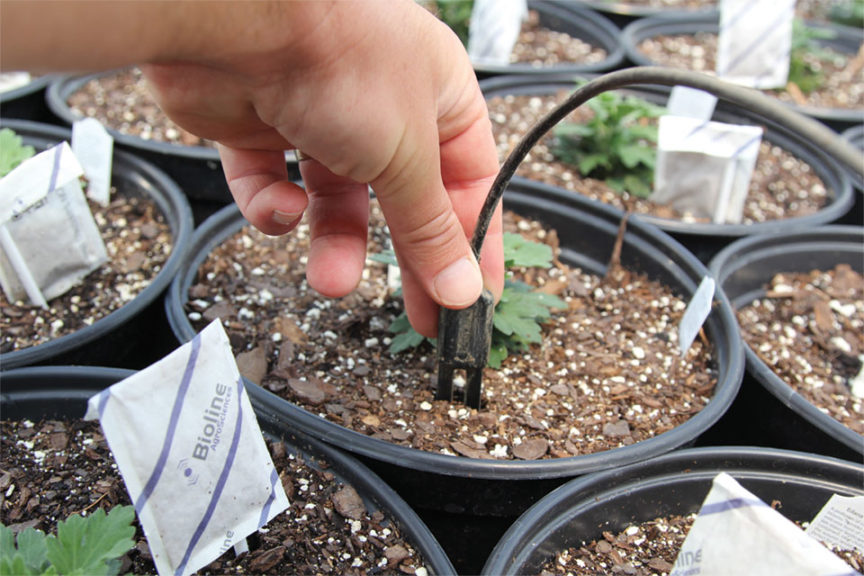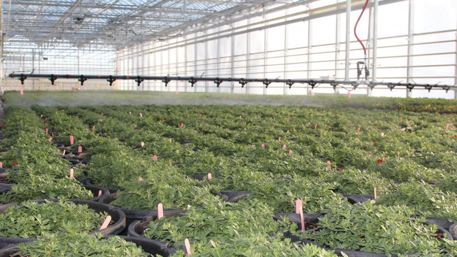 “With the soil moisture sensors, I can set a crop of verbena to be grown more dry than a crop of calibrachoa in the same bay, and once a plant dries down to its given set point, the boom then automatically kicks on and irrigates that crop,” Foertmeyer says. “The zones can be any size I want them to be, and I can set as many as I want in a given bay.”