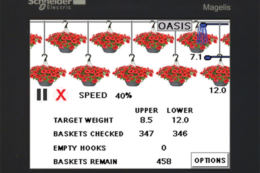 Oasis is installed on new or existing greenhouse cable conveyors. The grower sets the pre-determined weight desired for correct plant watering via a local controller, an office PC, or a mobile device. As each basket passes through the Oasis module, its weight is determined. The smart controller opens the proper water valve for only the time necessary to achieve the grower’s target basket weight.