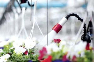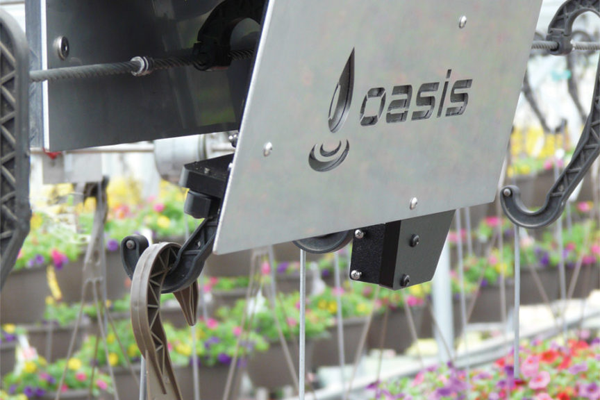 Control Dekk has developed a patented automated watering system that can be implemented with greenhouse cable conveyor lines. The Oasis is designed to reduce water use by up to 50% by giving each basket only the water it needs for optimum growth.