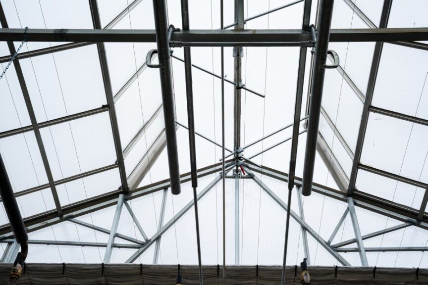“The Dual Atrium works well as a passive-cooled house with double the roof ventilation of the Vail Atrium. Unique roof vents open upward and outward for air removal and to prevent heat build-up for optimal air mixing without crop stress,” Thompson says. Crack the vents during storms without fear of rain getting in the house. With ample light for crops, the Dual Atrium is a great choice for multi-tier production.”