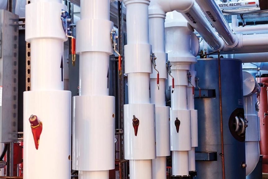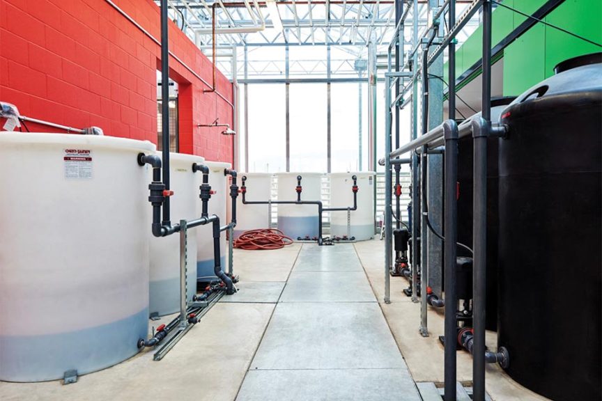 The greenhouse has a clean, open-spaced look, partly because all major process piping is buried in trenches to minimize shading. Here you see a mass array of pipes and pumps, which is the start of the process pipes. The facility has a 250-ton chilling unit that provides cold water from cooling towers and a boiler for hot water. Tank-roll units supply hot water for heating the units in the winter and cold water in the summer for cooling.